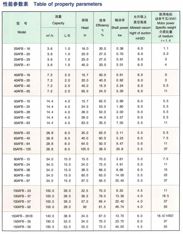 AFB、FB型泵是單級(jí)、單吸懸臂式耐腐蝕離心泵,該泵過流部位零件根據(jù)輸送介質(zhì)不同,全部選用各種耐腐耐磨合金鋼材料制造,泵的進(jìn)口壓力一般不大于O.ZMPa,必要時(shí)可達(dá)到0.35一0.4mpa,介質(zhì)溫度一20℃一+130℃,廣泛應(yīng)用于石油、化工、冶金、合成纖維、醫(yī)藥、食品等工業(yè)部門。